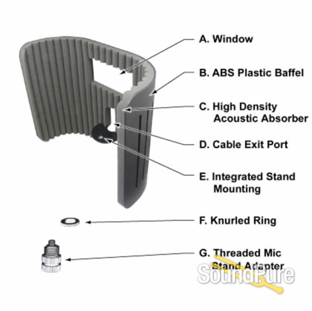 The VoxGuard features high-density open cell acoustic foam that provides maximum absorption throughout the vocal range. An extra large high impact ABS outer shell keeps unwanted noise out, while innovative slotted ports prevent excess bass buildup and resonance commonly associated with stand-mounted absorbers. Once mounted, a rear access cable port allows any hand held or studio microphone to be articulated and directed at a specific source. The VoxGuard has been updated for 2015 and now features a window that allows the vocalist to maintain visual communication between the engineer, producer or other band members.