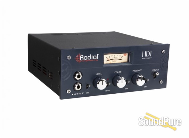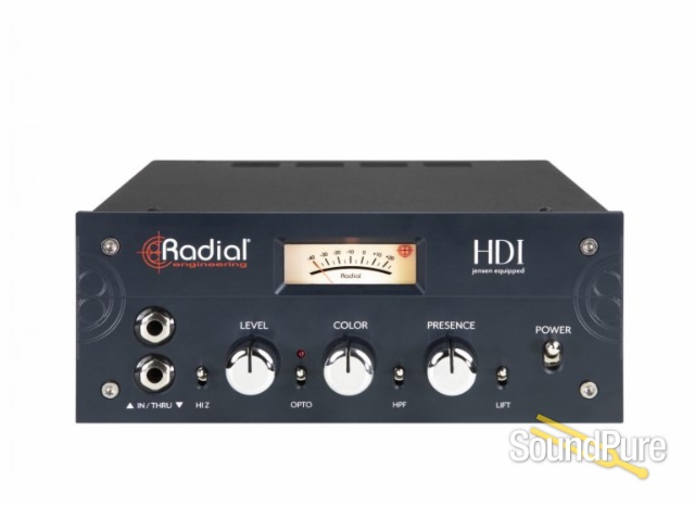 The HDI is Radial Engineering’s flagship direct box, designed to create exceptional sonic results with any instrument in both studio recording and professional touring applications. The HDI combines the best aspects of both active and passive direct boxes, utilizing premium Jensen transformers and a unique Color control circuit that can blend between an ultra-clean tone on one hand, and the warmth and grit of transformer saturation and harmonic distortion on the other. A simple but elegant feature set allows the engineer or musician to achieve their desired tone in seconds, with variable Level, Color, and Presence controls on oversized chrome-plated knobs. A smooth Opto compressor can be engaged for subtle peak reduction, and a HPF is included to remove excessive low end when pushing the unit hard into distortion. Both mic and line-level balanced outputs are provided, allowing you to connect directly to a recording interface without the need for an additional preamplifier. Finally, a responsive output meter for visual feedback.