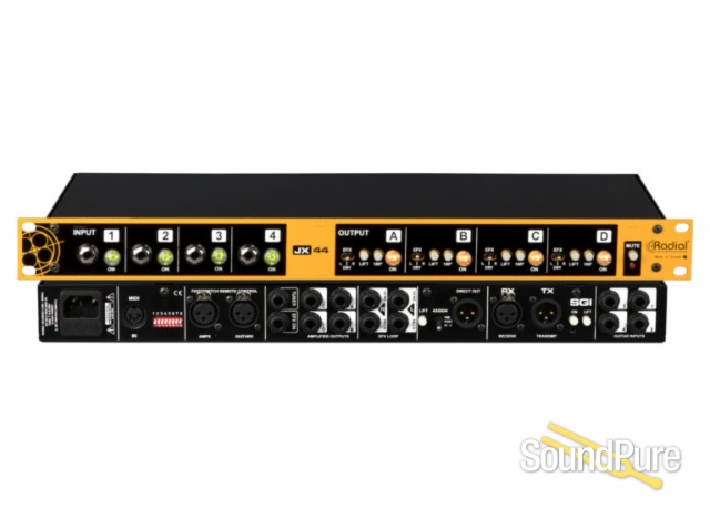 The JX44 also handles complex effects routing with ease, with connections for a local stereo EFX loop and the ability to assign individual EFX channels to any amplifier for wet/dry/wet setups. Remote pedalboards can also be added without signal loss or degradation using the optional SGI-44, giving the artist control over pedal FX without sacrificing tone, even from 100 feet away. While the JX44 V2 works on its own as a complete guitar control center, it can also be controlled remotely, with dual inputs for Radial JR-5 remote footswitches to control either guitar or amp switching, and a MIDI 5-pin connection for operation via MIDI controllers and foot pedals.