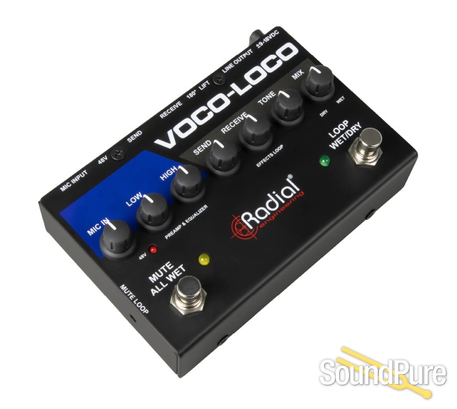 The Voco-Loco is an effects loop controller that enables an artist to add guitar effects pedals to a voice, sax, trumpet, or just about any other instrument you can think of. You connect the mic directly to the Voco-Loco, set the level and EQ and then the Voco-Loco sends the signal to the pedals via a standard ¼" send & return effects loop. Separate send & return levels are used to optimize signal-to-noise and reduce distortion. A tone shift control lets you compensate for overly bright pedals, the original dry signal is then blended with the wet effects signal using the mix control, and the output connects to the PA system. The Voco-Loco comes with an external power supply, but it is also compatible with 9V-18V pedalboard power supplies, and it generates 48V phantom to power a condenser mic or active direct box.