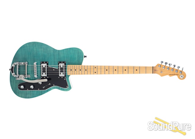 This limited edition 2012 release Reverend Flatroc features a maple topped body in a glowing Transparent Turquoise finish, Revtron II pickups and a Bigsby vibrato. The resulting instrument gets the player classic Rockabilly twang and growl in a handsome and totable sollidbody guitar!