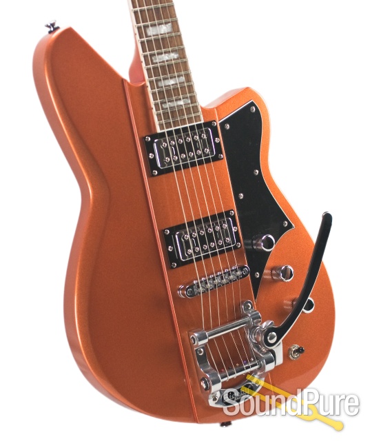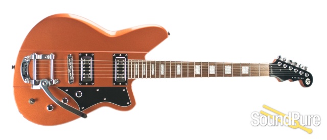 Regardless of the image in your mind, Reverend's Warhawk RT fits the description. With a lightweight korina body and 24 and 3/4" scale, the guitar is ready rock the moment she hits your hands. The Revtron pickups on this baby have a way of just bringing this guitar to life. A robust low end and high end sparkle come together to compliment a totally pronounced and punchy mid-range chime. This guitar really lends itself to the aggressive player, able to break up and get the grind you want when really digging into the strings. The roller bridge and Bigsby Licensed tailpiece work together wonderfully to round out a spectacular guitar from end to end. This guitar is perfectly suited for the rocker looking to really express themselves.