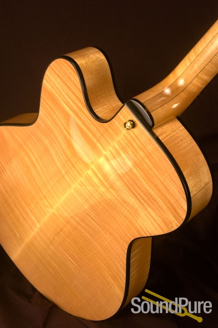 The traditional way of looking at the soundboard dictates the concept of either a flat thin top as in the Martin style steel string guitar, or the arched top for Jazz like the D'Angelico or Gibson instrument. We have combined the best of both worlds for the contemporary guitarist whose literature now crosses over into both worlds.