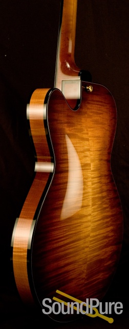 The traditional way of looking at the soundboard dictates the concept of either a flat thin top as in the Martin style steel string guitar, or the arched top for Jazz like the D'Angelico or Gibson instrument.  We have combined the best of both worlds for the contemporary guitarist whose literature now crosses over into both worlds.