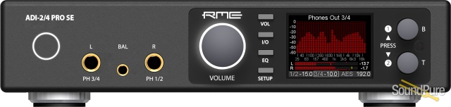 The ADI-2/4 Pro SE is a 2-channel analog input to digital and 4-channel digital to analog output converter in a half-rack (9.5") enclosure of 1 U height. Latest 32 bit / 768 kHz converters offer up to 123 dBA signal to noise ratio. Reference class tech specs throughout are combined with an unprecedented feature set. A powerful DSP adds all kinds of useful audio processing, including 5-band parametric EQ, fast Bass/Treble adjustment, Crossfeed, and a new concept in Loudness sound control.