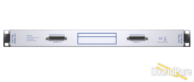 DTOX-16 I connects 16 XLR inputs to two D-sub 25-pin connectors (channels 1-8 and channels 9-16). The breakout panel supports all interfaces using analog 25-pin D-sub inputs as well as the following RME interfaces: M-32 AD, M-16 AD, M-32 Pro AD, M-32 Pro DA.