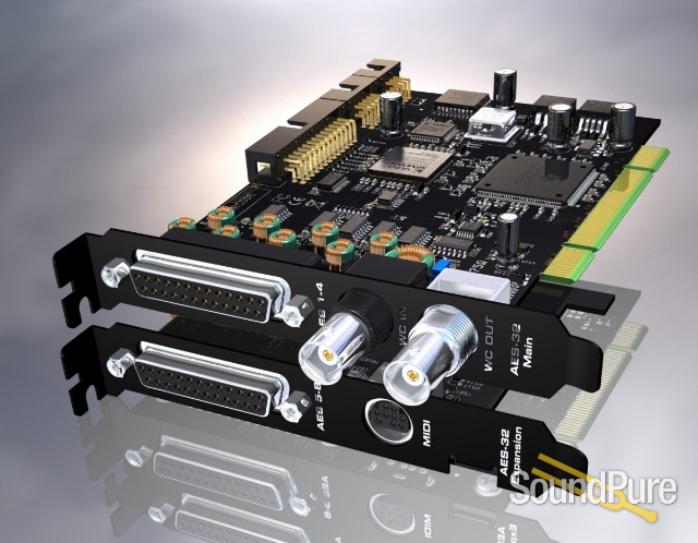 The Hammerfall DSP AES-32 is a short-length PCI card with AES/EBU interfaces. It provides eight AES inputs (16 channels) and eight AES outputs (16 channels) at 192 kHz sample rate. The card is also equipped with two MIDI I/O ports, word clock I/O, and can be used with the optional TCO module for synchronization to LTC and video.