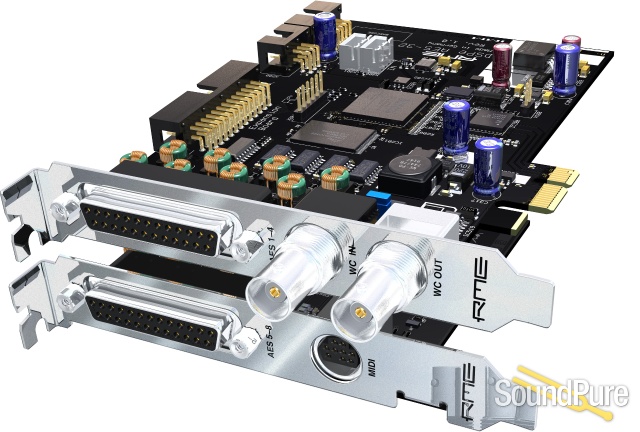 The HDSPe AES is a short-length PCI Express card with AES/EBU interfaces. It provides eight AES inputs (16 channels) and eight AES outputs (16 channels) at 192 kHz sample rate. The card is also equipped with two MIDI I/O ports, word clock I/O, and can be used with the optional TCO module for synchronization to LTC and video.
