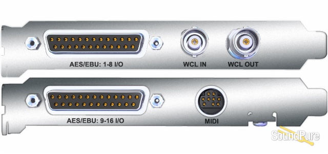 The card's mainboard contains word clock I/O and a 25-pin D-sub connector, providing four AES inputs and four AES outputs via standard digital breakout cable (Tascam pinout). The sensitive word clock input operates on Single, Double and Quad Speed signals automatically. The expansion board adds audio channels 9-16 and a connector for a MIDI breakout Cable with two MIDI I/Os (four 5-pin DIN connectors). It does not require a PCIe slot.
