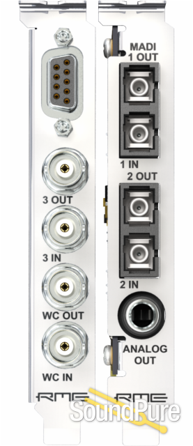 Three MADI I/Os - two optical and one coaxial are accompanied by one AES/EBU I/O and one analog monitoring output. To complete the feature set, a Word Clock connection and four MIDI I/Os were added. The complete technology and connectivity are highly integrated into the smallest possible amount of space - typical for RME. Only one PCIe slot is required on the motherboard, plus one free slot opening on the case.