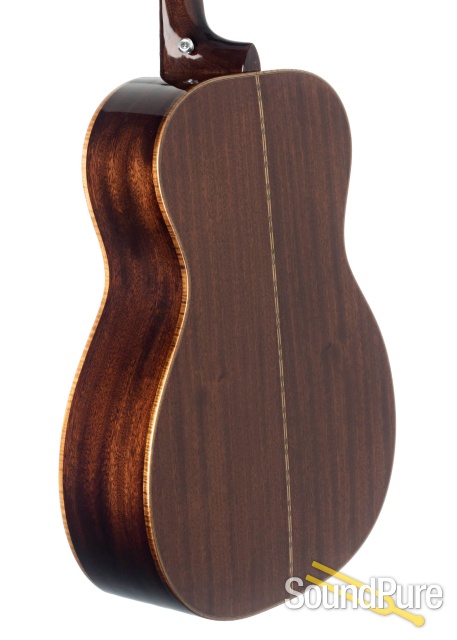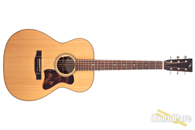 This Robson OM flaunts vintage appointments matched up with a versatile sound. Aesthetically, it's a graceful mix of classic markers of high quality: Peep the herringbone rosette and purfling as well as the 28-style back strip, along with the mashup Gibson/Guild tortoiseshell pickguard, mother-of-pearl dot inlays, wood bridge pins and figured wood binding along the African mahogany sides. Speaking of which, the 'hog construction imparts muscular bass, warm mids and pleasantly jangly treble. Combined with the high headroom of the Adirondack spruce top, you get a guitar that dishes back whatever you throw at it. Delicate fingerpicking? You got it. Thumpy alternating-bass blues? Yes, please. Fast, flashy strumming? Sure! Finally, you get an LR Baggs Anthem pickup system to plug in with confidence.