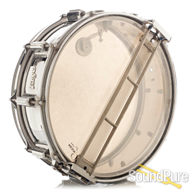 The Dyna-Sonic is a classic vintage snare with a rich full sound. This 5x14 responds beautifully and roars in lower tuning ranges while projecting solid cracks at higher ranges without losing its warmth. Played by great jazz musicians but also versatile enough for rock or hip hop back beats depending on tuning. Of note, this beauty has a small dent in the shell just behind the throw-off. We believe the drum may have fallen while attached to the stand. The throw-off has been tested and is functional. This is a great player-condition drum to add to your arsenal.