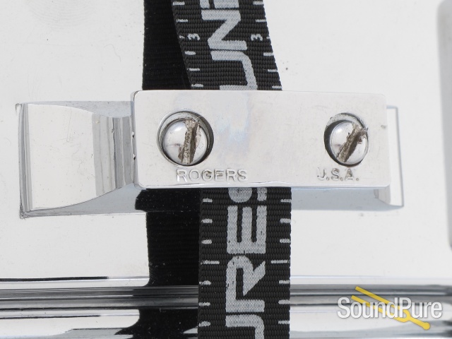 This is a good condition Rogers 5x14 chrome over brass Powertone snare drum and is here on consignment. Serial #17999-Dayton Ohio. The shell interior is super clean and the exterior is in good condition with minimal pitting. The lugs do show some slight pitting, but considering their age are in good condition as well. A couple of the tension rod heads and the snare sensitivity dial has lost some chrome, but the drum is otherwise in good condition. The snare wires and snare side head appear to be relatively new and the batter head shows some wear. Great player drum!