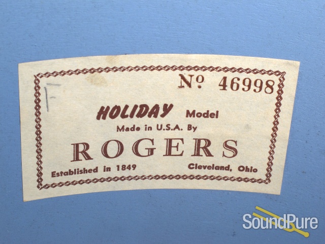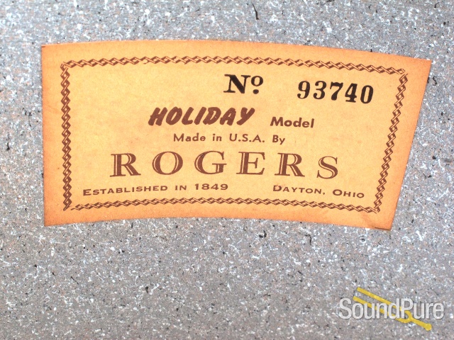 This is a great condition Rogers Holiday shell pack and is here on consignment. Serial #'s BD-47225, 13" 46998, 16" 93740-Dayton Ohio. All parts with the exception of a couple tension rods appear to be original and no extra holes or modifications have been done to the shells. The 16" floor tom may have come from the transition period as it has the grey speckled interior. The rack and bass drum interiors are both flat grey.