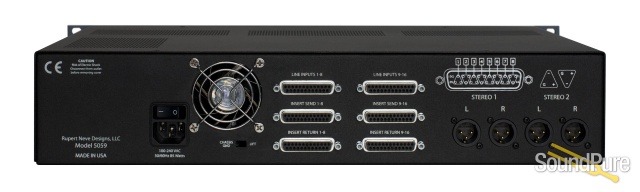 One drawback to mixing “in the box” is the inability to use high quality analogue outboard equipment. Channel inserts are provided in the 5059 to streamline interconnections with analogue outboard equipment and to allow for further expansions of the 5059’s capabilities. By connecting a second 5059 to the insert outputs of a 5059, the dual stereo outputs can be used as a way to add 4 auxes to each of the 16 channels.