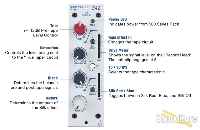 BLEND - Controls the mix of pre and post tape signals. This allows the engineer to dial in a subtle amount of the tape effect, to better control the amount of saturation, tone and soft clipping in the post blend signal. As the signal gets more saturated, dialing back the blend can be a great way to impart the feel of tape, while maintaining a similar level of detail and transparency. NOTE: The blend control does not affect the Silk and Texture controls, as that circuitry is located at the physical output of the unit.