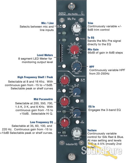 Like Rupert’s designs from his time in Shelford, the 5052 preamplifier has 72dB of discrete, class-A gain coupled with serious square-core transformers. Unlike the classics however, the output transformer features the Silk Red / Blue and Texture controls from the Portico II Series to hone the harmonic content and tonality of the output stage. By engaging these controls and sufficiently driving the output, the 5052 can produce up to 4-5% THD (primarily 2nd order, some 3rd order), bringing a richness and thickness to tracks when desired with no danger of overloading the output stage. With Silk disengaged, the output is modern and pristine, yet still retains Rupert’s signature larger-than-life transformer sound. The mic pre section also includes a sweepable 20-250Hz high-pass filter, Mic / Line selection, 48V phantom power, and polarity reverse.