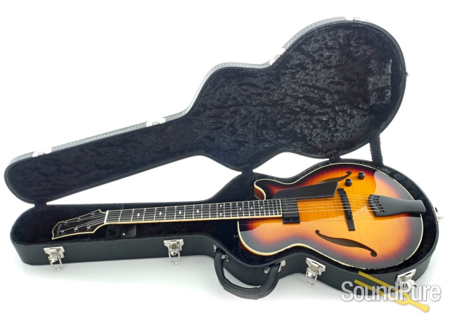 The all acoustic brother of the Semi-Hollow, the SS-15 features the same body as the Semi, but is all acoustic with traditional jazz guitar appointments and styling. The thin body provides a more immediate acoustic response than its bigger siblings, and has no sonic peer when amplified. The 1 3/4″ nut width and 14 frets to the body give the SS-15 a familiar comfort to any jazz guitarist. For the touring guitarist, the SS-15 is a perfect size for overhead airline bins and is more roadworthy than solid wood instruments.