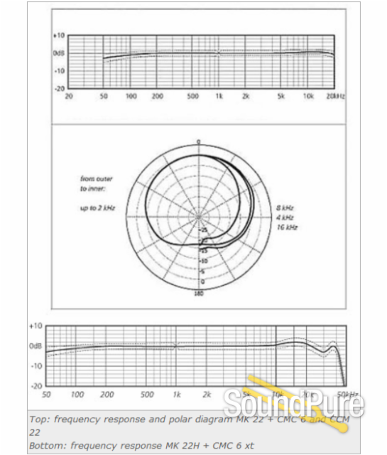The MK 22 has been developed for use as a spot microphone. It unites the strengths of the MK 4 and MK 21 capsules. Its directionality is only slightly less than that of the MK 4 cardioid, while its sonic character is reminiscent of the MK 21 wide cardioid. Its directivity is essentially constant throughout the frequency range. Its inherent low-frequency response is somewhat more pronounced than that of the cardioid, while proximity effect is somewhat less.