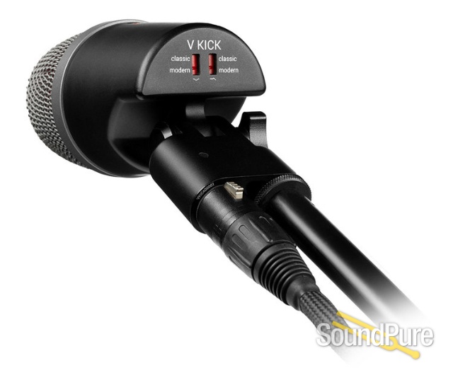 The V KICK is the most compact and versatile drum microphone in its class, intended for use with kick (bass) drums and other sources such as miking bass guitar speaker cabinets, floor toms or other large drums where low-frequency energy is of the utmost importance. Its integrated swivel joint allows for any required mic placement, and its specialized capsule provides a sound character tailored specifically for kick drums, which can be further shaped with the use of two switches on the rear side of the microphone. From warm and classic to modern and aggressive, the V KICK gives you any kick drum sound you need.
