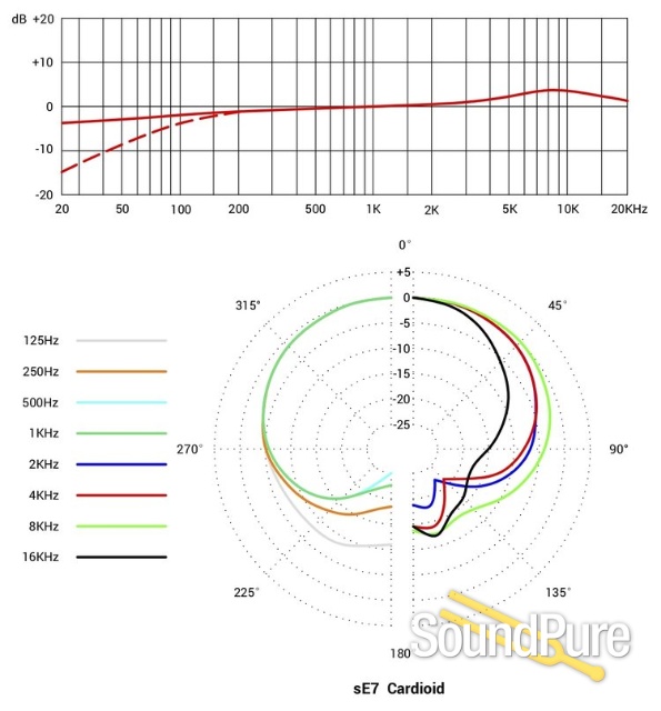 The discrete electronics and the switchable attenuation pad ensure a high dynamic range, with high sound pressure level (SPL) handling capability and extremely low-noise components. The switchable low-cut filter helps eliminate rumble or footfall noise, and can also compensate for an excess of bass frequencies caused by the proximity effect. This enables the sE7 to close-mic many instruments including electric guitar speaker cabinets, brass instruments and drums.
