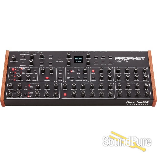 The Prophet Rev2 retains all of the key features of the Prophet ’08 and expands on them. It has twice the polyphony, twice the mod matrix, waveshape modulation on all waveforms, digital effects per layer in stacked or split voice mode, a polyphonic step sequencer per layer, and more. The result is a true analog powerhouse.