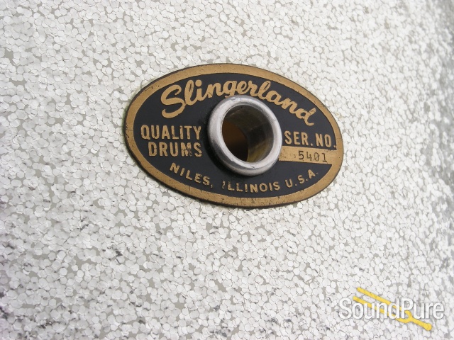 This Niles badge Slingerland 8x15 Silver Sparkle Snare Drum is here on consignment. Originally, this drum started as a Gold Sparkle wrap but has evenly faded into a Silver Sparkle. Dated May 1962, this drum features a mahogany shell with maple reinforcing rings and chrome over brass hoops. This is an 8 double-sided lug with chrome hardware that has pitting. Tension rods, snare wires, and heads have been replaced, but all of the other parts appear to original. The Silver Sparkle wrap has a little flaking near the top of the drum at the seam but the seam is still tight. Serial # 5401