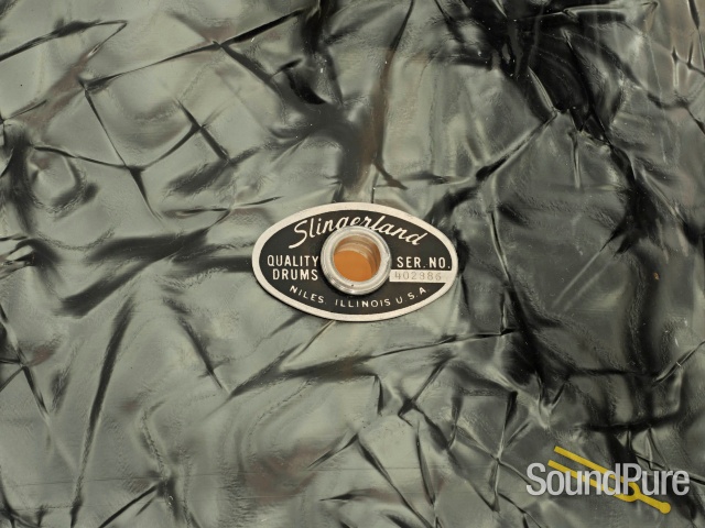 The Black Diamond Pearl finish has yellowed slightly but appears to be even. The seams are tight on the drums and shows no signs of bubbling or lifting. All of the parts appear to be original, and the chrome is in overall great condition showing little to no signs of pitting. There are no extra holes or modifications that were done to the set. The rack tom and the floor tom each have the stick saver hoops and the single tom holder is included. The bass drum hoops appear to have the original paint and only has a little bit of bass pedal rash. The inlays, like the wrap on the rest of the set, is tight and shows no sign of lifting or separating.