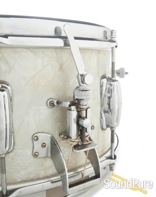 Produced in the 1960s, this Slingerland Radio King snare drum is here on consignment. It has a natural maple interior, the original Marine Pearl wrap, and has tight wrapped seams. The wrap does have a slight yellowing, but it appears to be even.