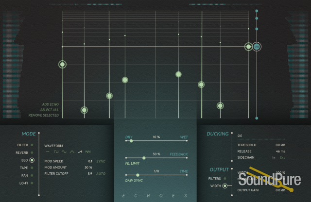 Echoes is outfitted with parameters that let you tweak your sound to perfection. You can adjust time in milliseconds or sync it to your DAW tempo and set the amount of Feedback you want. (To ensure your repeats never exceed -6 dB, we included a feedback limiter.) And you'll never have your vocals obscured by your delay again. By adjusting the threshold in the built-in ducking feature, most echoes are ducked under the vocals, and you get the full sound of the echo trail off at the end of each verse. The Output section lets you widen your stereo image, collapse low frequencies to mono, or filter your echoes to fit your track perfectly.