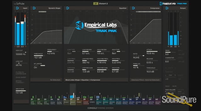Based on components from the precisely-modeled Empirical Labs Lil FrEQ and Mike-E units, Trak Pak is our punchiest-ever channel strip for Console 1. Configured for mixing pros and optimized for the Console 1 workflow, Trak Pak features Lil FrEQ's High-Pass filter and a newly designed Low-Pass filter in the Input Section, Lil FrEQ's De-esser/HF Limiter in the Shape Section, and Lil FrEQ's parametric EQ and High/Low Shelving in the Equalizer Section.