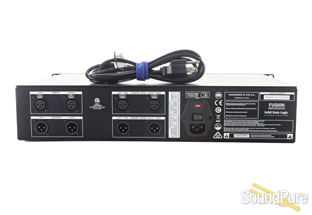 SSL has also always been known for clever connectivity and features that streamline and accelerate production workflow. Fusion fits right in with a collection of workflow enhancing features including: +/-12dB Input and Output Trim controls, an Input overload LED, large peak-hold metering, a front-end 3rd order High Pass Filter with three selectable cut off frequencies, and tri-colour status indicators for the Vintage Drive and HF Comp/LMC sections. A set of XLR connections can be used either as a Stereo Insert for stereo mix bus processing or switched to function as a Mid-Side (MS) circuit enabling separate compressors or EQ to be applied to the middle (centre) and sides of a stereo signal. In Stereo Insert mode the insert point can be switched to pre-Violet EQ, when in MS mode the insert can be switched to pre-Stereo Image controls. Input and Output connections are via XLR.