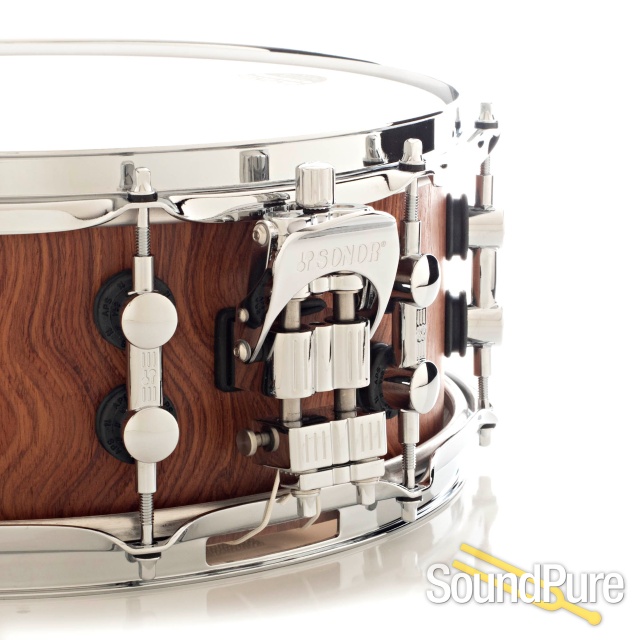 Sonor 14x5.5 SQ2 Medium Beech Snare Drum with a Bubinga veneer finished with a semi-gloss finish.
