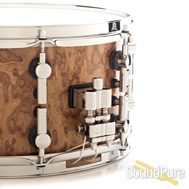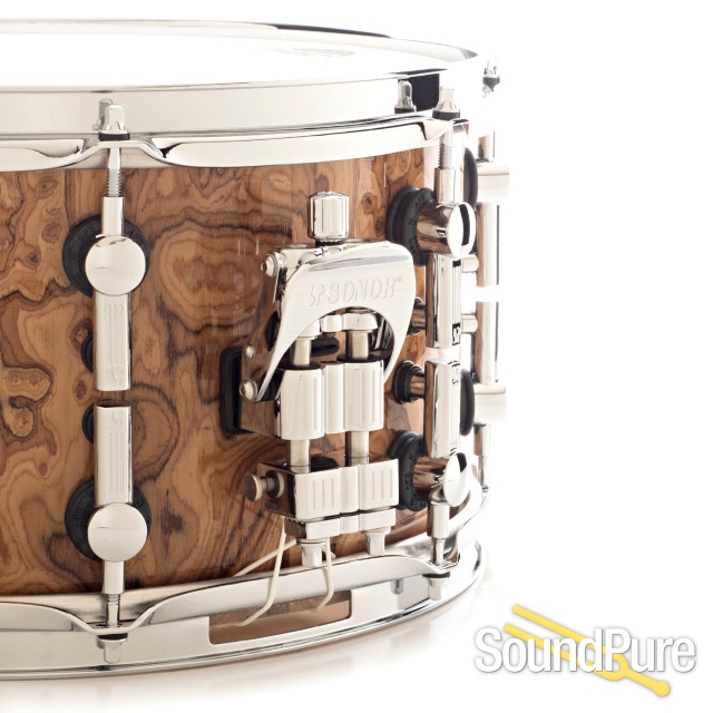 Sonor 13x7 SQ2 Heavy Beech Snare Drum with a Chocolate Burl veneer finished with a gloss finish.