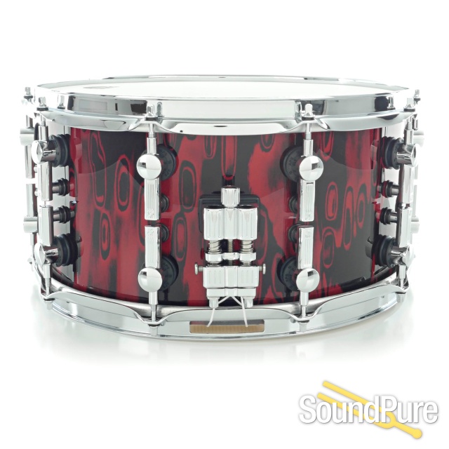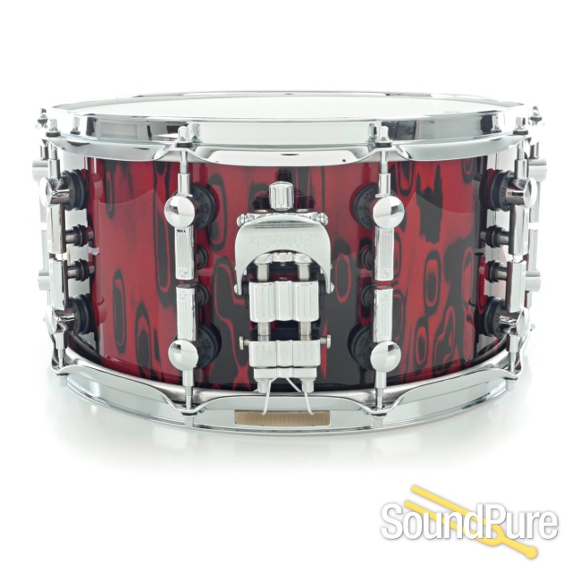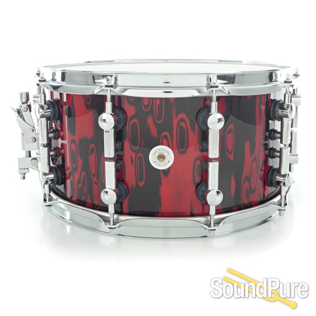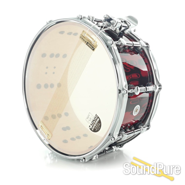 Sonor 14x7 SQ2 Heavy Birch Snare Drum with a Red Tribal veneer and a gloss finish.
