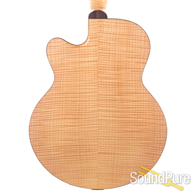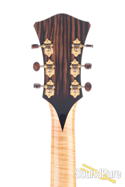 This wonderful and very comely 16" archtop comes from the one-man shop of Steve Andersen. For #526 Steve substituted the usual choice of black ebony for Macassar and followed it through all the way to the pickup cover completing a very elegant look for an even more elegant sounding guitar. Thanks to the 16"x3" dimensions, this piece is extremely comfortable to play and hold through long sessions in the studio or on the stage.