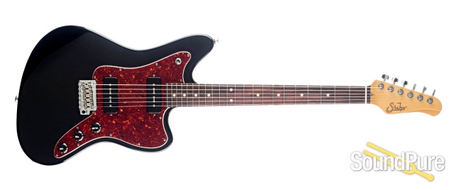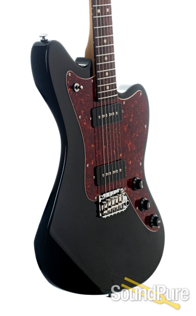 Sleek black Classic JM with hum cancelling P-90's and vintage tremolo bridge.