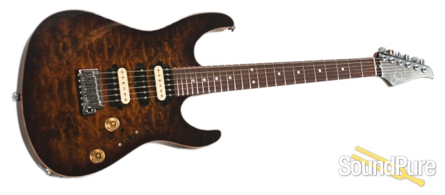 This Suhr Modern is a delight in every way! Featuring a stunning Bengal Burst finish on quilt maple, mahogany body and neck with Pau Ferro fingerboard, this baby is a visual knockout. Fire it up and be blown away by the HSH pickups configuration with versatile splitting capabilities and Suhr's famous "blower switch". Guthrie Govan is an incredible player and this guitar more than lives up to his reputation!