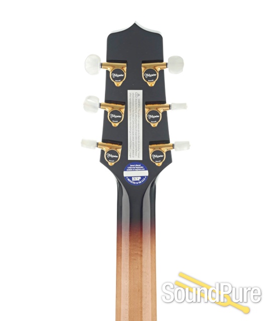 Premium design appointments include an ebony fingerboard with ivory binding and mother-of-pearl “snowflake” inlays, a black headcap, gold tuners with pearl buttons, a natural bone nut and gloss brown sunburst finish.