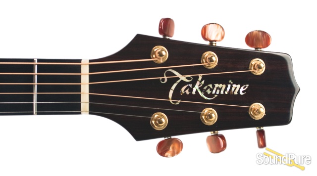 I felt like I'd been re-united with an old friend as soon as I picked this Takamine up...like it had just returned from wandering some dark New Mexican desert for the past few years. You notice the immensely comfortable neck and overall playability right away, followed by a taut, full response from bass to treble. It's got this overall dark, woody tonality fleshed out by its jumbo-like body dimensions. While you'll have no problem filling a room with this guitar's wizened, direct voice, you'll find that the pickup system is more than ready for hitting the stage.