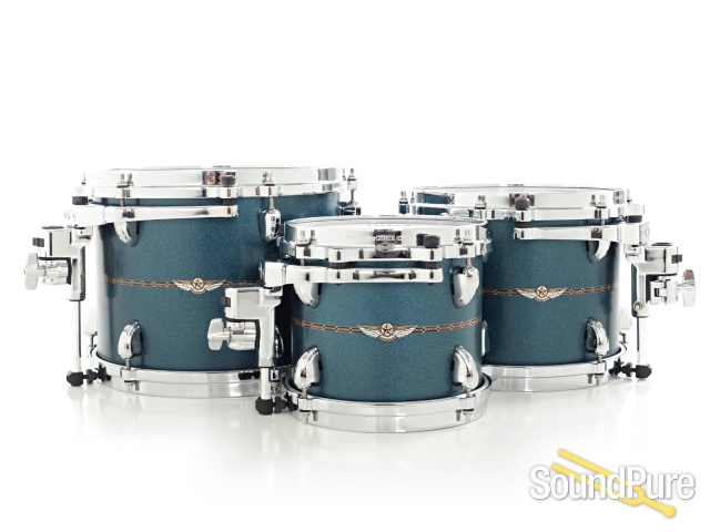 This a like-new Tama STAR Bubinga kit custom ordered set that originally sold for $9249. They are made by hand in Japan much like the esteemed lines of Tama's glory day heritage. This consignment set came to us with most of the drums still in their factory-sealed boxes. These drums are a beautiful Satin Blue Metallic lacquer finish and have inlays on both the inside and outside of the shells. The exterior inlay incorporates the Star winged logo badge while the interior inlays do not. The bubinga shell is a thin 4.5mm with a single vertical inner ply of Cordia plus a 9mm Sound Focus Ring. Much like the previous flagship lines for Tama, the Star series features the familiar die-cast hoops with an improved intergrated mounting system for rack toms and suspended floor toms. Floor toms also incorporate the Quick Lock system seen in the Starclassic series which combines the mounting bracket and memory lock into one unit. The Star series also has a new cast lug with a bridged design for minimal shell contact. Tama put a lot of time and thought into the Star series where the player reaps all of the rewards.