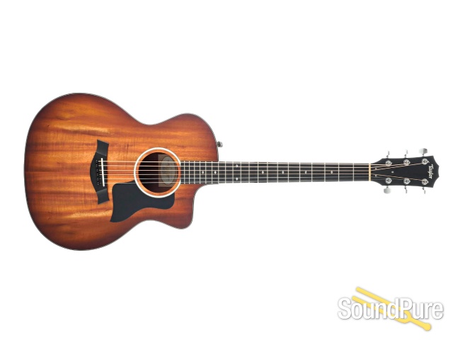 Fans of Hawaiian koa will love the look, feel and sound of this all-koa Grand Auditorium. A shaded edgeburst elevates the vintage appeal of the solid koa top, which is paired with layered koa back and sides, while a gloss finish wraps the body in a rich sheen. The Grand Auditorium’s musical versatility makes this a great all-purpose guitar for both strumming and fingerpicking, and the hardwood koa top will even out a lively attack to produce a focused, linear voice. Player-friendly modern features include a cutaway and Taylor’s ES2 acoustic electronics. Among the distinctive appointments are a single-ring faux pearl rosette in an interlocking “fishbone” pattern, black binding, Italian acrylic small diamond inlays, and chrome tuners. The guitar ships in a Taylor deluxe hardshell case.