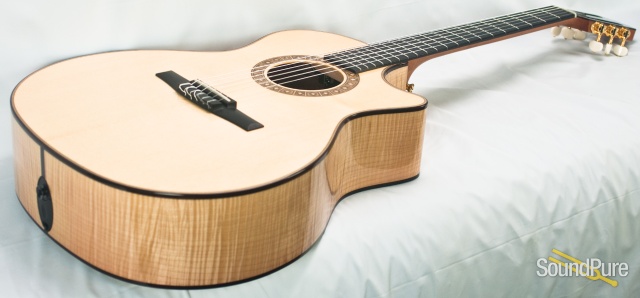 Gorgeous choice for the intrepid fingerstylist looking to explore the classical realm without committing to a 2" nut!  The Englemann spruce top offers unparallelled responsiveness and warmth while the Big Leaf maple on the back sides and isolates and strengthens the fundamental of each note, leaving you all the room you need to weave complex chordal arrangements and picking patterns into an expressive voice other guitars simply won't allow for.  With this wonderful Taylor in your hands you'll be delving into everything from cool, composed bossa nova to fiery rasqueado techniques in no time!