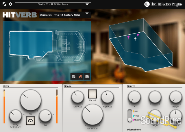 HitVerb gives you full control over your virtual mic distance as well as position, including height and width. You get three mic options to choose from: Neumann® U67s, Coles® 4038 Studio Ribbons, and Sennheiser® MKH 800 Twins.