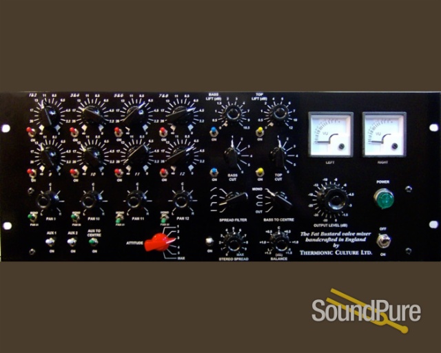 More than just a straight summing mixer, this new offering provides sound shaping possibilities too, with a simple yet powerful bass ( 50Hz ) and treble ( 10kHz ), Stereo Width and Depth controls, and the new 'Attitude' distortion section. The inputs are arranged as 4x stereo pairs and 4 mono, all with mutes, the mono inputs also have pan pots too. Two additional Aux inputs are provided for echo returns and the optional forthcoming Little Bustard 16 channel expander. The Fat Bustard lives up to its name-guaranteeing Big Fat Sounds!