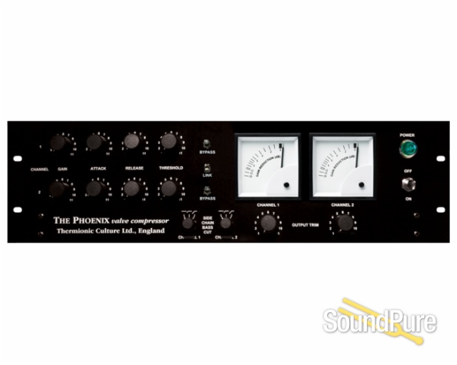 Thermionic Culture have added a third Phoenix stereo valve compressor to the range. This SC, or side chain version is virtually identical to the standard model, but has in addition the same side chain filter section from the Phoenix Mastering Compressor (MC). This side chain filter provides 75Hz & 150Hz, but more permutations are possible when the MC is used in stereo mode with the link switch engaged. So, the SC model has the same higher gain structure as the standard model, which means it can slam more than the Mastering model, which makes it more useful for individual tracking or mixing functions, but added the extra versatility of having one of the best two bus compressors available for your stereo bus due to the chain filters.
