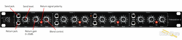 The Transceiver is a four channel insert station.The main function is to convert balanced signals into unbalanced and back again without losing any signal quality. Each channel has a send level, a return gain control, a return polarity switch and a blend control. With the new added blend function you can choose how much of the inserted effect you want to add. The Transceiver 2 is a transformerless balanced design for the best possible signal handling, a flat frequency response and low harmonic distortion and noise. The balanced output has a high driving capability to drive input transformers, also the unbalanced send has a high driving capability.