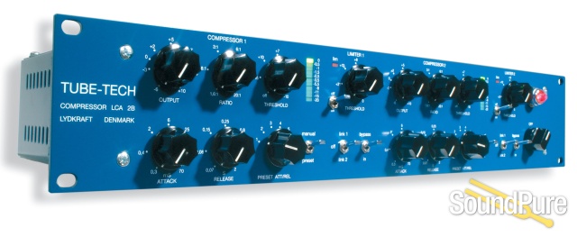 The TUBE-TECH LCA2B is a two-channel unit with an independent compressor and limiter per channel. The unit is all tube based (except for the power supply and side chain circuit). The VCA (1 dual triode) is placed between the input transformer and the output stage (2 dual triodes).