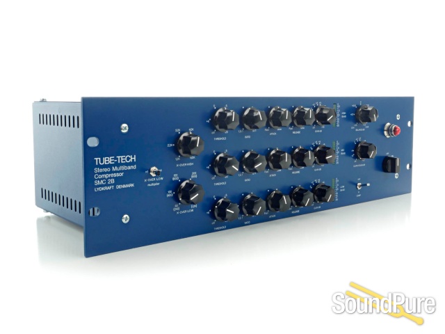The TUBE-TECH SMC 2B Stereo Multiband Compressor features three independent optical stereo compressors. The signal is divided into three bands (Low, Mid & High) by 6 dB/octave x-over networks with variable frequencies: 60-1200 Hz for Low/Mid band and 1,2-6 kHz for the Mid/High band.