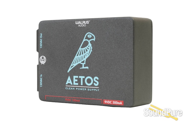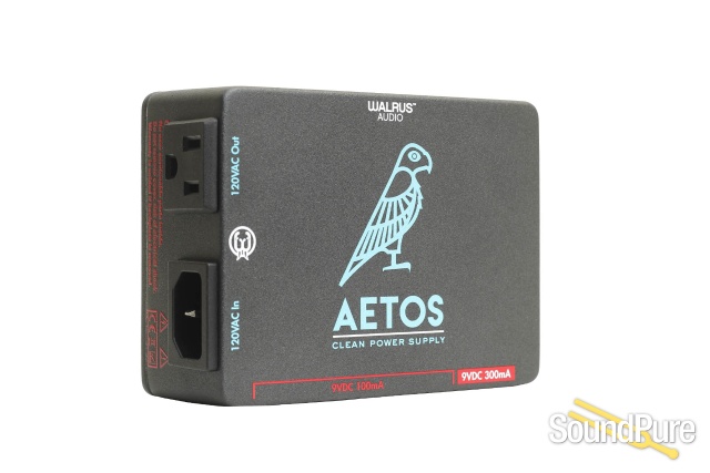 The Walrus Audio Aetos is an 8-output, isolated power supply, utilizing an internal custom wound toroidal transformer to provide the highest noise filtering and cleanest power, giving artists the purest sound in their signal chain. The Aetos is housed in a solid die cast enclosure and is 4.7”long x 3.7” wide x 2” height and has 8 total 9VDC outputs, 6 are 100mA and 2 outputs are high current outputs (300mA) for higher current drawing pedals like line 6 DL series modelers, the Boss Twin Series Pedals and many digital modulation pedals on the market.